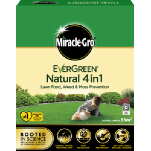 Miracle-Gro EverGreen Natural 4 in 1 is a lawn food that prevents weeds and moss from developing in your lawn. Natural and pesticide-free, your lawn will be greener, thicker and healthier after the first application.