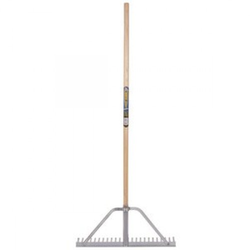 Professional landscaping rake with a 605mm x 115mm head that has 24 tines. Made from extruded aluminium and attached to a solid ash wood handle. Sold loose.