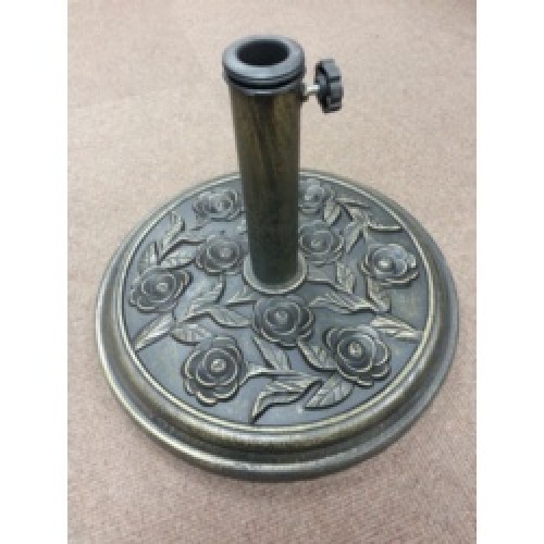 ø45 x 34cm Bronze effect resin covered Adjustable parasol grip For use with ø32/38/48mm Poles Material: Plastic Plastic Type: Resin The Pagoda 9kg Bronze Parasol Base is a beautiful vintage style design of flowers that will make any parasol look fantastic. The 9kg base features an adjustable width making it suitable for use with 32, 38 and 48mm parasol poles.