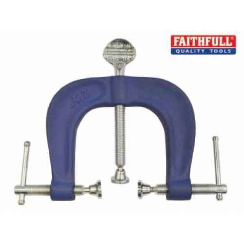 The Faithfull FAIGEDGE edging clamp is a three-spindle C-frame clamp with accurately machined spindles to providing a smooth operation and maximum clamping pressure. The broad swivel shoe adjusts to the correct angle to apply even pressure and the drop-forged steel body provides added strength. The clamp has a powder coating in order to protect it from corrosion.