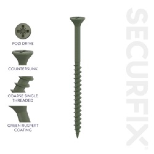 Partially threaded design to prevent jacking Made from carbon steel Salt spray tested Perfect for outdoor jobs such as decking, fencing and building garden furniture Drive: Cross/Pozi Head: Countersunk Finish: Green Coated